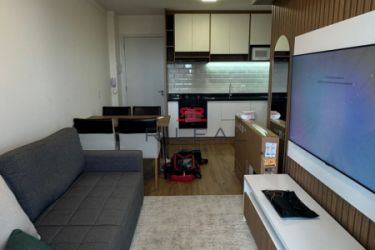 Apartamento mobiliado, localizado na Vila Nova Cidade Universitária, com 35m², 1 quarto, 1 banheiro, ar condicionado, televisão, fogão, armários na cozinha e no quarto, micro-ondas, cama de casal.